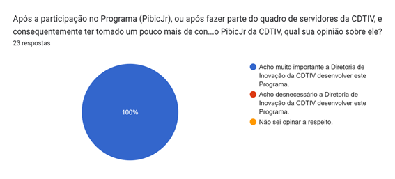 Após uma breve explicação sobre o funcionamento do programa 95,7% dos orientadores, pais e mães de bolsistas e do público interno do CDTIV consideraram o PIBIC Jr. “muito importante” para a formação científica e acadêmica dos estudantes.