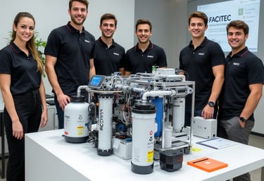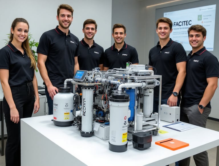 Estudantes do ensino médio e superior desenvolvendo soluções inovadoras para desafios locais em Vitória, utilizando ciência e tecnologia.